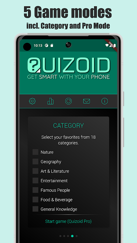 • Kategori: Pilih hanya kategori kegemaran anda untuk kuiz yang anda suka!