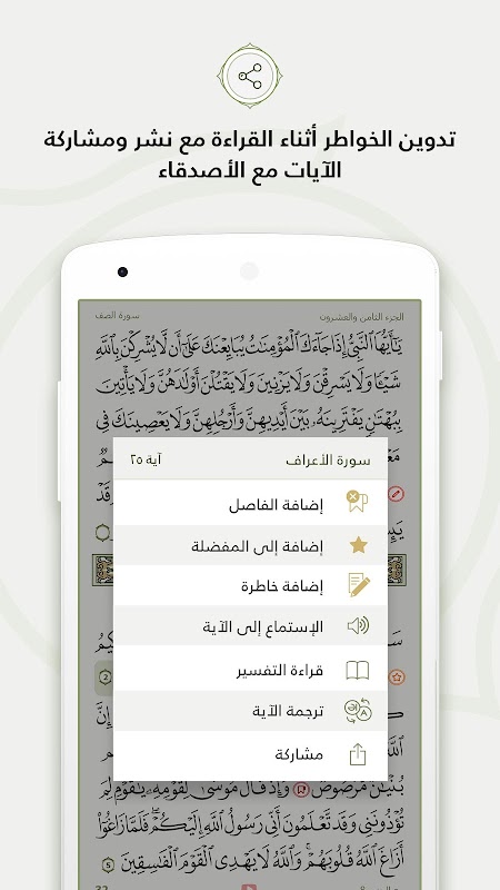 * Mendengarkan bacaan Al-Quran (memilih untuk mendengar seluruh surah atau bahagian tertentu) oleh banyak pembaca yang paling hebat di dunia Islam.