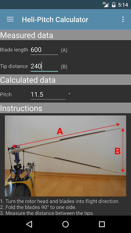 Heli-Pitch Kalkulator digunakan untuk mengira nilai padang dengan memasukkan panjang bilah dan jarak tips.