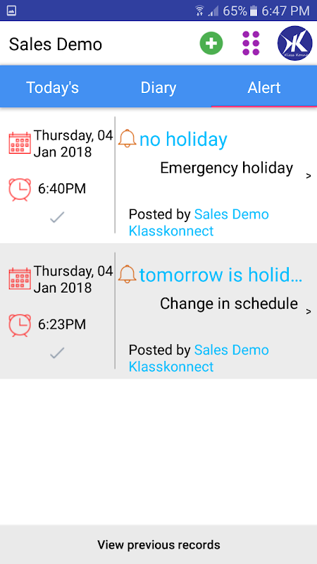 KlassKonnect™ - The ultimate class to parent communication tool. This class Application provides classes with an easy way to tell parents everything they need to know about class, like posting Attendance,Absentee Forms/ sick notes , Diary, Insta Alerts, Student profile, Click to call any parent in case of emergency at classroom .