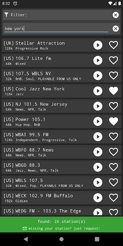 Anda boleh menambah stesen pada kegemaran anda dan memainkannya dalam pemain radio.