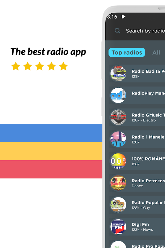 Dengar semua stesen radio kegemaran anda seperti Impuls, Traditional Hip Hop, Petrecaretzu, Taraf, Petrecere Romania, Manele, lautaru, Digi, Pro Popular, Intens, Kiss, Antena Satelor, Muzica Populara, 100% ROMÂNESC, Trinitas# dan banyak lagi! Dan tidak kira di mana bandar atau negara anda berada, anda boleh mendengar stesen radio tempatan kegemaran anda dari mana-mana sahaja di dunia!