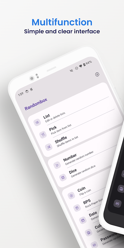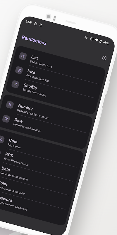 Randombox menawarkan pelbagai fungsi praktikal, daripada melukis dan menyusun senarai hingga melempar dadu rawak, membolehkan anda menangani dilema membuat keputusan dengan mudah. Selain itu, ciri seperti membalikkan syiling rawak, menjana nombor rawak, mencipta kata laluan rawak, menghasilkan warna rawak dan menjana tarikh rawak semuanya disertakan. Bagi mereka yang menggemari permainan, anda juga boleh menyerikan dengan ciri Rock-Paper-Scissors!