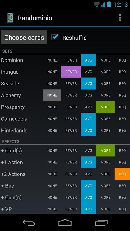 Memilih satu set kad kerajaan untuk bermain permainan Dominion itu. Menentukan kekangan terperinci mengenai berapa banyak kad pelbagai jenis yang anda mahu dimasukkan ke dalam permainan. Termasuk data kad untuk semua kad diterbitkan. (Sekarang termasuk pengembangan Empires itu.)