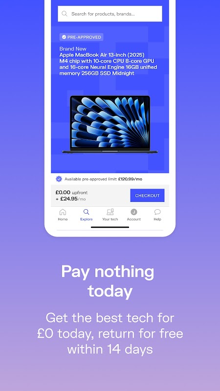 - Dapatkan teknologi terbaik dengan bayaran pendahuluan £0, dengan pemulangan percuma dalam masa 14 hari.