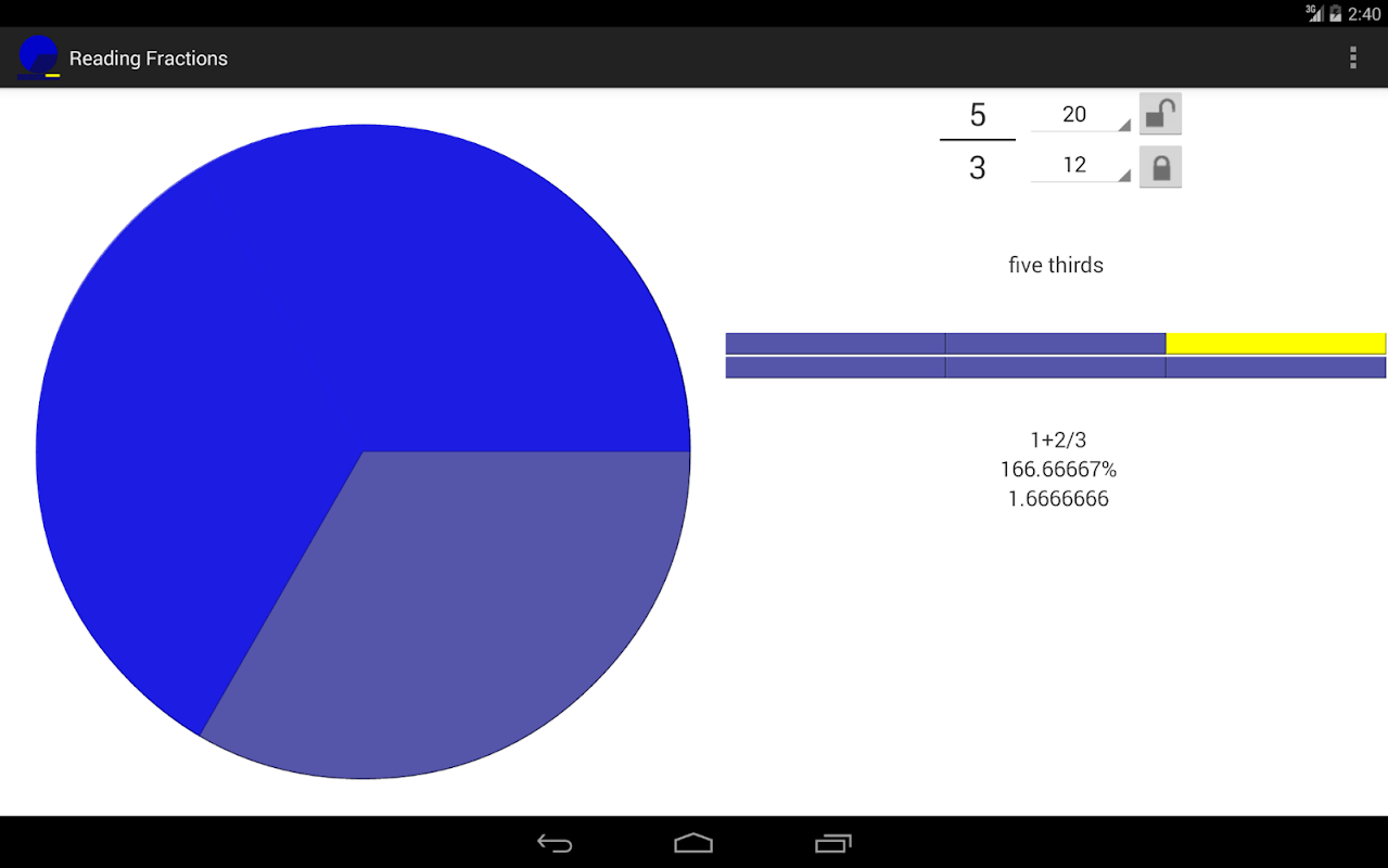 Aplikasi ini membolehkan anda melihat pecahan diwakili dalam bentuk bertindih bulatan dan bar.