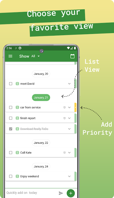 ✔ menandakan tugas yang telah diselesaikan secara visual. Segera dapatkan bonus - rasa bangga dengan seberapa produktif anda menghabiskan hari anda.