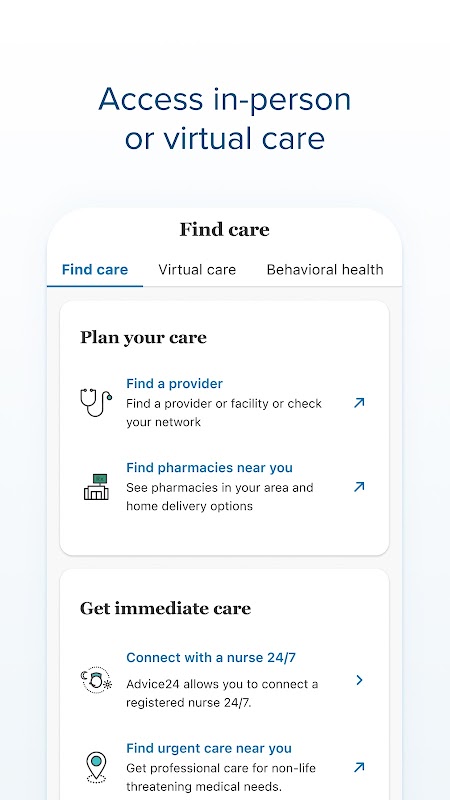 Dapatkan pilihan penjagaan yang betul untuk keperluan kesihatan, gaya hidup dan bajet anda yang unik. Lawati skrin Cari penjagaan untuk menggunakan alat carian pembekal kami atau berhubung dengan doktor maya, pakar kesihatan tingkah laku, ahli farmasi dan banyak lagi.