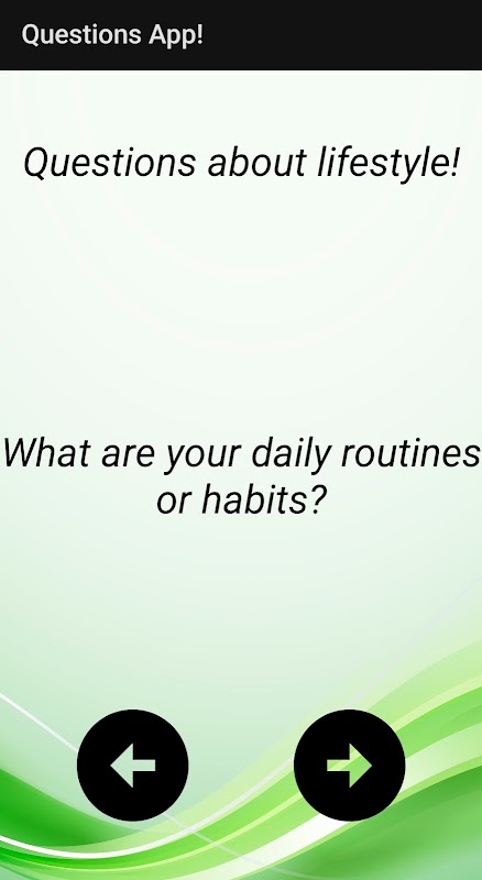Buka kunci hubungan yang lebih mendalam dengan orang tersayang dan temui perspektif baharu dengan apl mesti ada kami, Apl Soalan! Dengan 6 kategori yang pelbagai, anda tidak akan kehabisan pemula perbualan yang merangsang pemikiran. Daripada soalan penemuan diri dan gaya hidup, kepada gesaan yang meningkatkan hubungan, anda akan memperdalam pemahaman anda tentang diri anda dan orang lain. Bawa perbualan perjalanan anda ke peringkat seterusnya dengan soalan bertemakan perjalanan kami. Dan dengan kategori khas untuk interaksi kumpulan dan perbualan ibu bapa-anak, anda akan memupuk hubungan yang lebih kukuh dengan orang penting dalam hidup anda.
