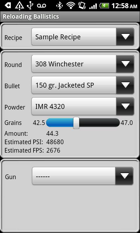 Clicking on a spinner (drop-down box) will bring up a predefined list of items (recipes, rounds, bullets, etc.), allowing the user to select an item or add a new one. If an item is already selected, long-clicking the spinner will open an edit window so the user can change the information stored for that item.