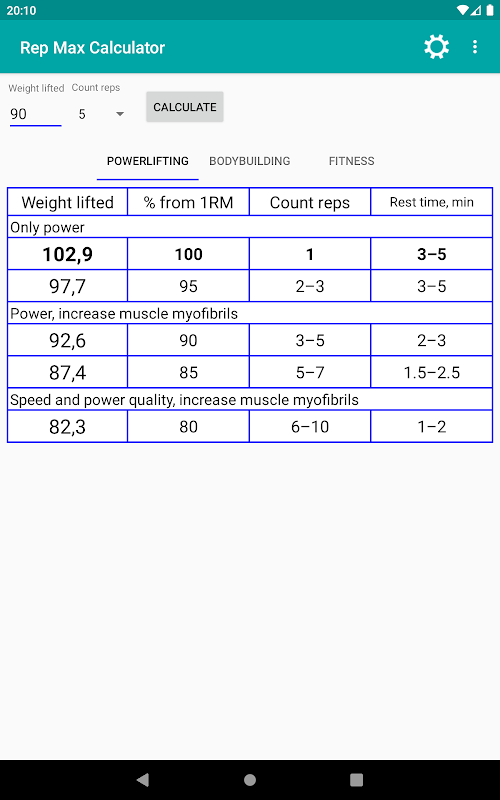 Berulang kalkulator maksimum. maksimum berulang (RM) adalah berat maksimum yang boleh diangkat kepada beberapa kali. Pengiraan 1-40 bilangan repeates mengikut berat yang ditentukan bagi powerlifting, bina badan dan kecergasan.
