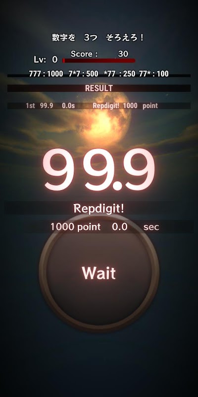 Ia adalah permainan untuk menghentikan pemasa dikira dari 99.9 saat dengan nombor kedua (Repdigit).