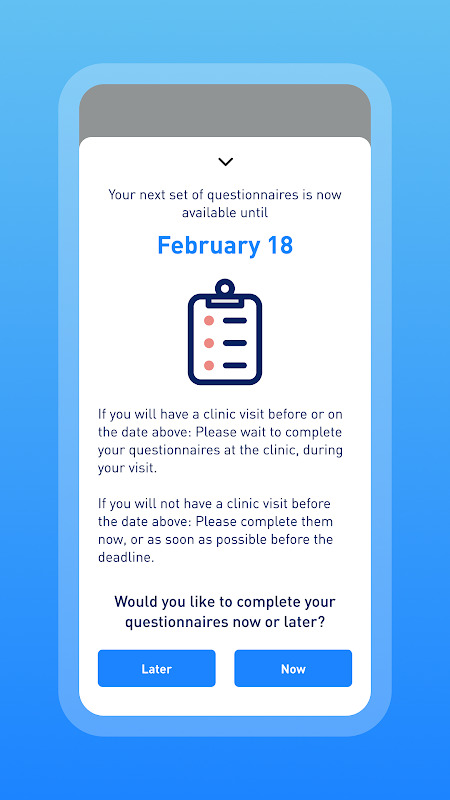 Sebagai sebahagian daripada PERCUBAAN TRIO041 / REPLACE, anda boleh menggunakan aplikasi ini untuk menjawab soal selidik mandatori berkala yang akan membantu memastikan pasukan penjagaan anda dimaklumkan tentang status kesihatan dan kualiti hidup anda yang berterusan. Anda juga akan berinteraksi dengan maklumat kajian penting, dan jika berkenaan, jejaki rawatan anda.