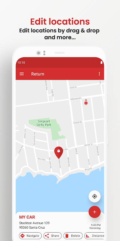 Aplikasi Return membantu anda mencari jalan kembali ke lokasi yang anda simpan. Mungkin kedudukan kereta anda di bandar besar atau hanya tempat bertemu rakan-rakan di kemudian hari, yang juga dapat dikongsi bersama. Kerana antara muka pengguna yang bersih dan intuitif, aplikasi ini sangat mudah digunakan. Cukup tekan penanda di bahagian bawah untuk menyimpan lokasi semasa anda dan beri nama. Anda boleh menambah nota dan gambar ke setiap lokasi yang disimpan.