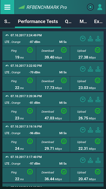 Aplikasi mudah alih RFBENCHMARK PRO memungkinkan pengukuran liputan radio operator mudah alih dan pengujian kualiti sambungan Internet untuk teknologi akses radio yang berbeza, seperti: GSM, 3G, LTE, Wi-Fi, serta perkhidmatan Internet tetap