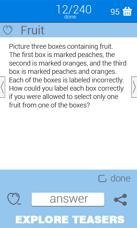 The brain teasers are separated into 5 different categories. Over 300 selected brain teasers and riddles ready to get your brain thinking.