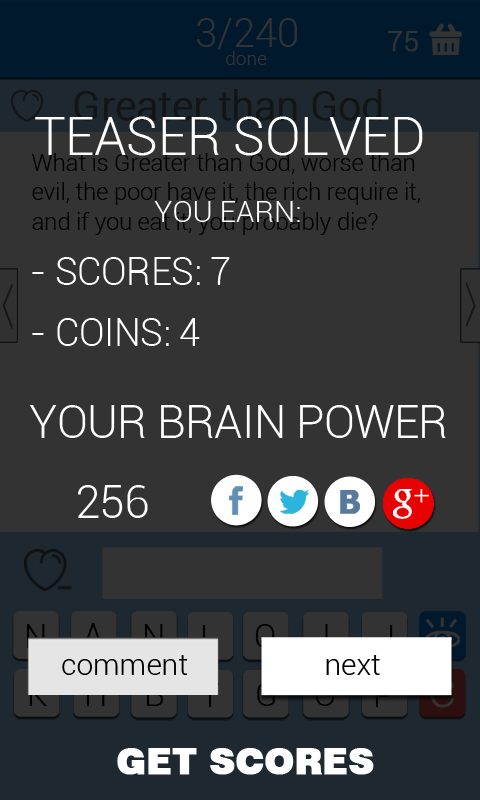 Get more scores to increase your brain power. Compare your result with your friends and other players!