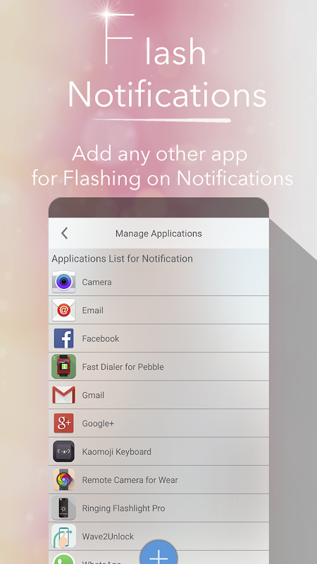 - You could add any application inside the "notification application list" for flashing flashlight when you receive notification form those apps. And we are supported you to customizable number of flash or the speed of the Flash for individual Application that you added.
