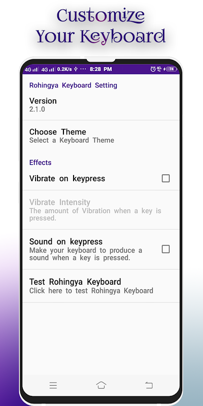 You've got bored of searching for Rohingya Keyboard? I created the first free application on the Google Play Store just for your needs. This is simple and the best Rohingya Keyboard for you to write Rohingya in all apps of your phone with the variety of letters and special charaters which is finally at the palm of your hand, go for it, and enjoy texting for hours! .Wait no more, just download and install this amazing keyboard in a few simple steps!