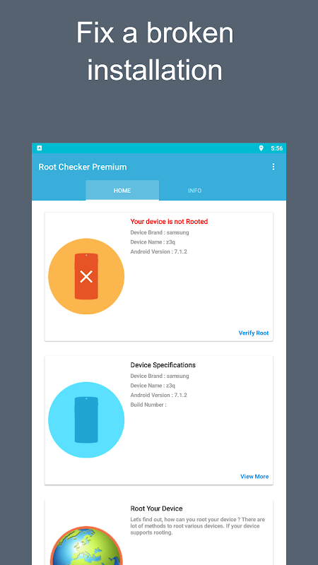 Works on even the newest android users and devices with a simple method to check their device for root (administrator, superuser, or su) access. Root Checker provides a very simple user interface that easily notifies the user whether or not they have properly setup root (superuser) access.