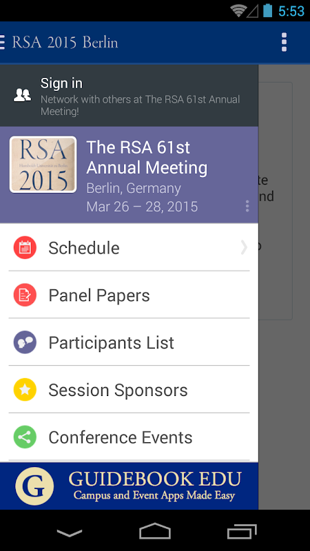 The RSA 2015 Berlin app provides you with all the program information for the 61st annual meeting of The Renaissance Society of America in Berlin, Germany from 26 to 28 March 2015 on your mobile device. The app gives you access to abstracts, panel titles, speakers and other participants, sponsors, special events, maps, schedules, and more. Search by keyword, browse by speaker name, paper title, session sponsor, or day and time. Use the maps to see where the session rooms are located. Save the sessions you want to attend to My Schedule. The conference program portion of the app works offline; no internet access is required once you’ve downloaded it save for quick automatic updates. In addition to serving as a mobile program for the conference, with web access the app is your guide to Berlin with resources for where to find coffee near the conference hotels, entertainment listings, well-reviewed local lunch and dinner options, and museum and library listings.