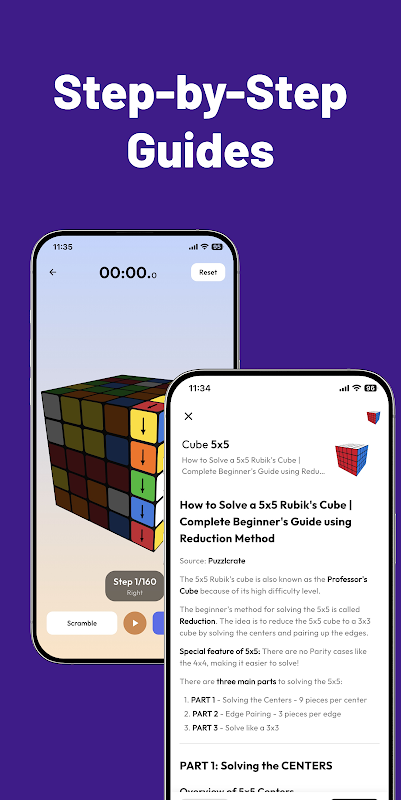 Penyelesai & Simulator Kiub Pintar: Gunakan penyelesai kiub untuk memasuki keadaan kiub anda dan dapatkan penyelesaian langkah demi langkah yang jelas. Penyelesai ini menganalisis kiub Rubik anda dan menunjukkan pergerakan tepat untuk menyelesaikan aplikasi kiub, disegerakkan sepenuhnya dengan simulator kiub.