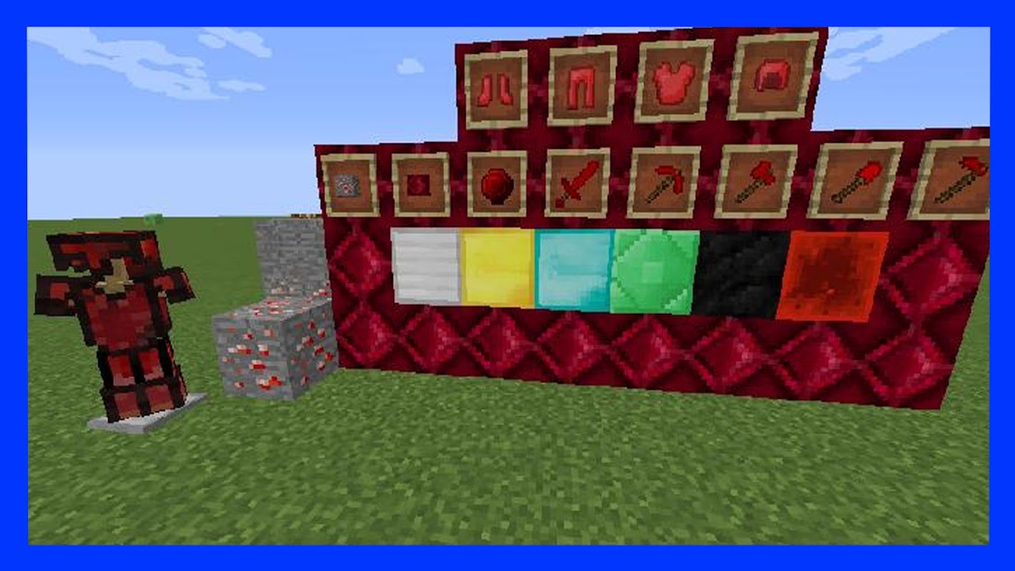 Mod Ruby Items for Minecraft PE very similar to Spiderman No Way Home mods for minecraft a lot of various ruby items made of precious metals among them and items of labor and weapons and even armor that protects much better than diamond