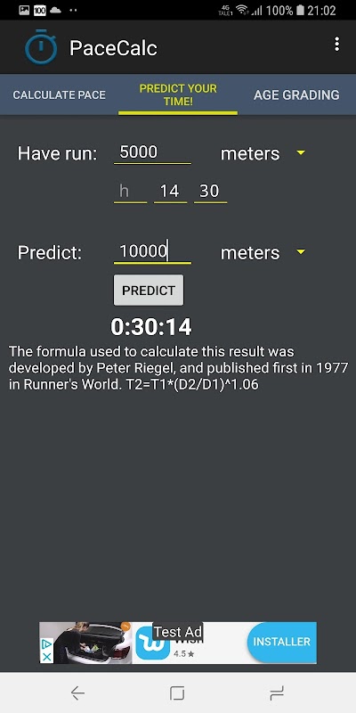 Juga termasuk kalkulator bergred umur yang menggunakan jadual WMA (World Masters Athletics) / WAVA untuk mengira hasil peringkat umur.