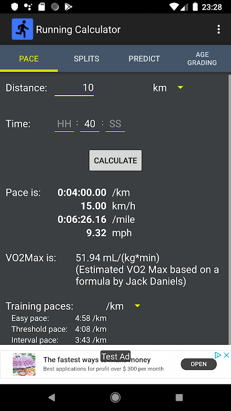 Aplikasi kecil ini akan mengira laju dan pecahan selepas pengguna mempunyai jarak input dan masa yang digunakan. Juga akan mengira anggaran VO2Max dan mencadangkan langkah-langkah latihan.