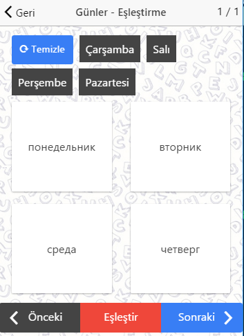 3-berkembar: jawapan kepada rawak 4 4 perkataan russian dan cuba memadankan perkataan Turki. Buang yang tidak sepadan dan cuba lagi.