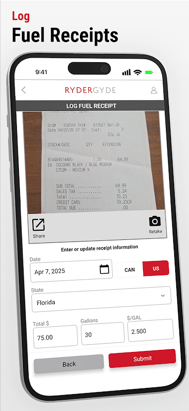 • Log resit bahan api: Pemandu boleh mengimbas, memuat naik dan berkongsi resit bahan api untuk kekal mematuhi pelaporan Cukai Bahan Api Antarabangsa.