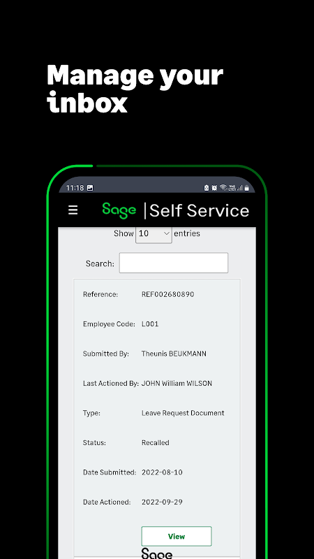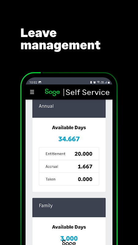 Sage HR & Payroll Mobility membolehkan pekerja untuk melihat slip gaji dan meninggalkan baki pada telefon pintar mereka. Pekerja yang mempunyai akses kepada sistem Self Service dalam talian juga akan dapat untuk memohon cuti, mengemukakan tuntutan perjalanan dan mengemaskinikan butiran peribadi / perbankan bergantung kepada tetapan Keselamatan ditakrifkan oleh pejabat Gaji.