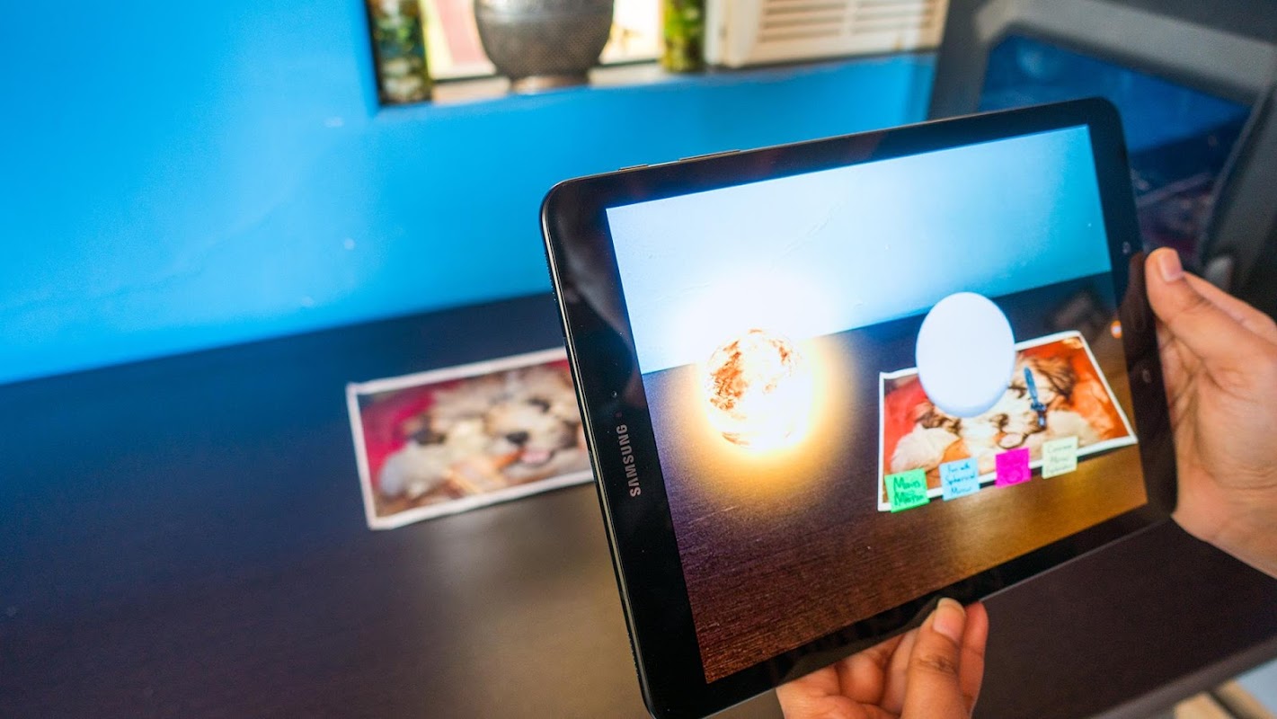 Step 3) Rotate your device and make sure the red circle on the right side of the screen moves into the center of the bigger circle. As soon as it turns green your Personalized Science Lab will appear on that surface. Then keeping the background image in camera frame, move your device slowly to any angle you wish.