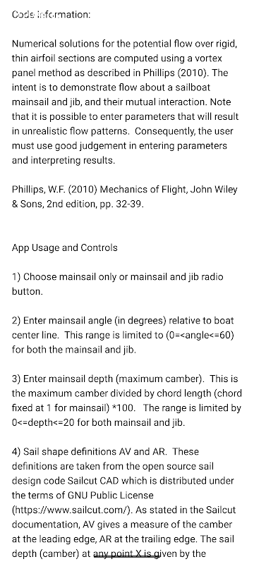 Apl ini menggunakan kaedah panel vorteks untuk memodelkan aliran potensi 2D di sekeliling airfoil nipis — sesuai untuk menganalisis prestasi mainsail dan jib. Hebat untuk pelayar, pereka bentuk, jurutera atau pelajar.