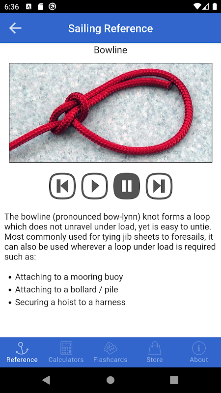 Yang baru! Kini mengandungi animasi pengajaran menggambarkan bagaimana untuk mengikat beberapa knot nautika paling biasa. Setiap simpulan disertai dengan penerangan ringkas menggariskan aplikasi yang sesuai. The Bowline Knot dimasukkan dengan aplikasi utama, dengan knot lain yang ada untuk membeli di-app sebagai add-on yang digabungkan.