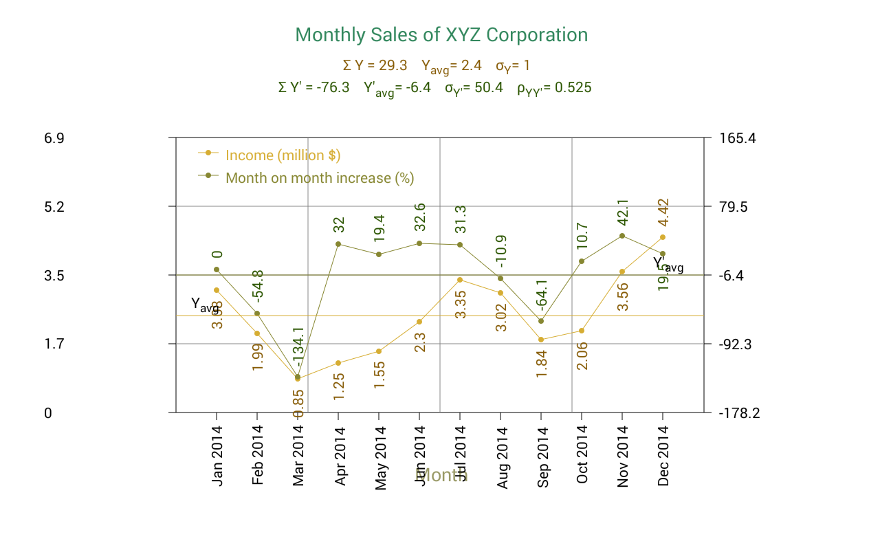 Perform simple statistics on the sales data to find the total sales, average sales, standard deviation from the average and more. The stats could, for example, help point out the effectiveness of a promotional campaign on the sales. They may be shown on the graph canvas too.
