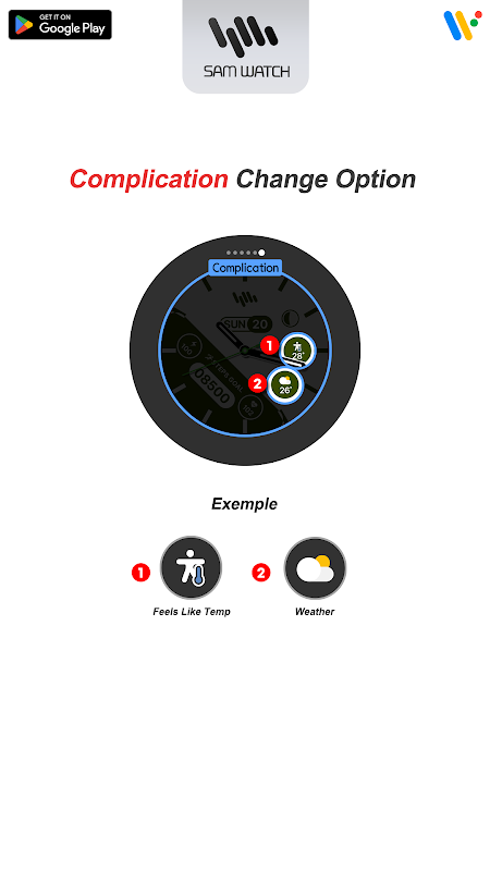 *Apl ‘Panduan Pemasangan SamWatch’ ialah apl tambahan yang menyokong muat turun apl pada peranti Wear OS. Ia mungkin berbeza daripada tangkapan skrin muka jam apl ‘Panduan Pemasangan SamWatch’ dan tangkapan skrin muka jam yang sebenarnya dimuat turun. Kebanyakan produk aplikasi Watchface SamWatch termasuk aplikasi untuk telefon pintar. Apl untuk 'Panduan Pemasangan SamWatch' hanya membantu anda memuat turun apl Wear OS.
