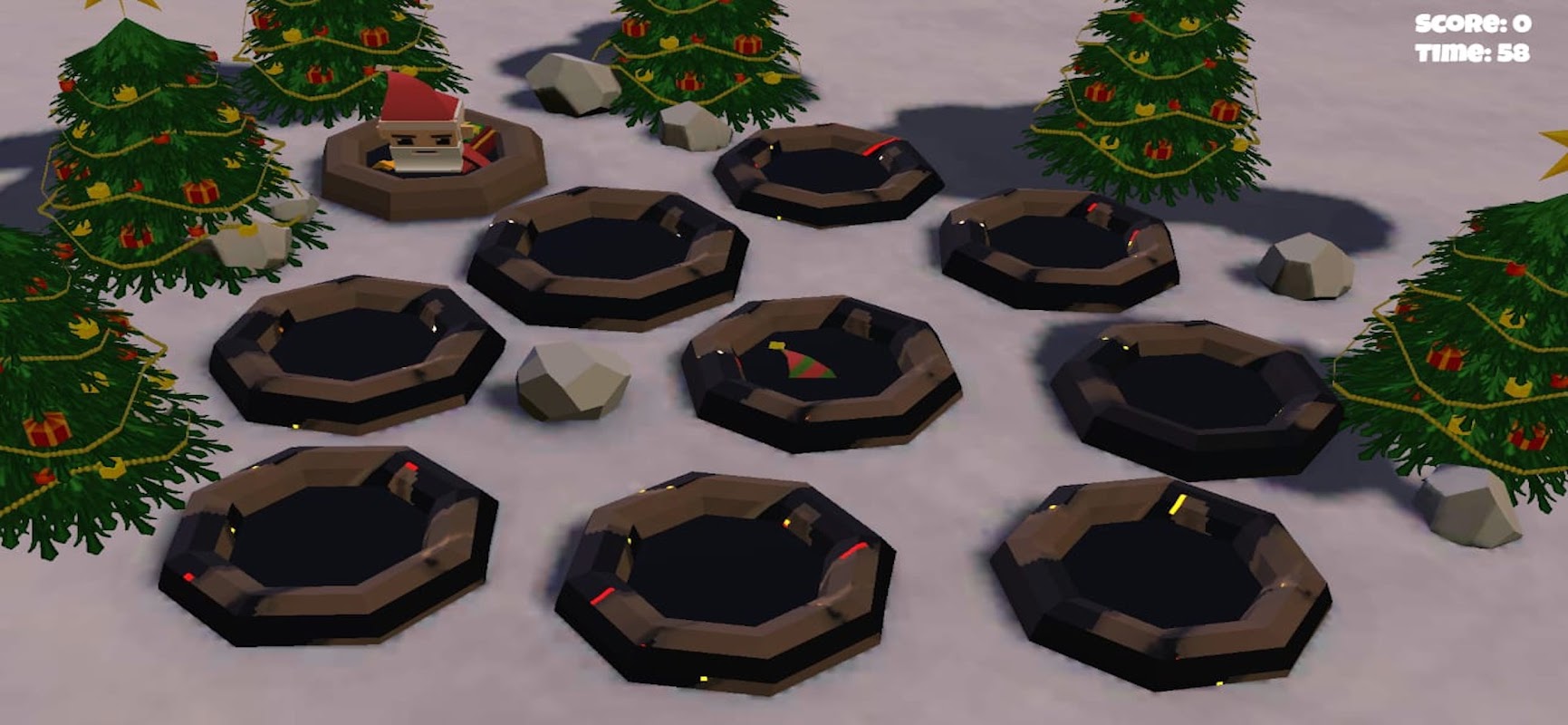 Each hole contains a Santa claus , Once the game starts, the Santa claus will begin to pop up from their holes at random. The object of the game is to force the Santa back into their holes by hitting them directly on the head with the mallet, thereby adding to the player's score. The more quickly this is done the higher the final score will be.