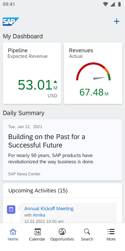 Dengan Awan SAP untuk Pelanggan untuk Android, anda boleh mendapatkan cerapan masa nyata tentang data pelanggan syarikat anda yang sentiasa berubah di mana-mana dan pada bila-bila masa. Apl ini mengakses penyelesaian SAP Cloud untuk Pelanggan dan membolehkan jurujual bekerjasama dengan pasukan mereka, berkomunikasi dengan lebih baik dengan rangkaian perniagaan mereka dan membuat keputusan termaklum terus dari Tablet Android mereka.