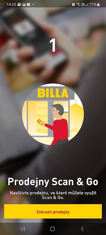 1. Muat turun apl BILLA Scan & Go pada peranti anda daripada Gedung Google Play atau App Store, lancarkan dan cari kedai terdekat.