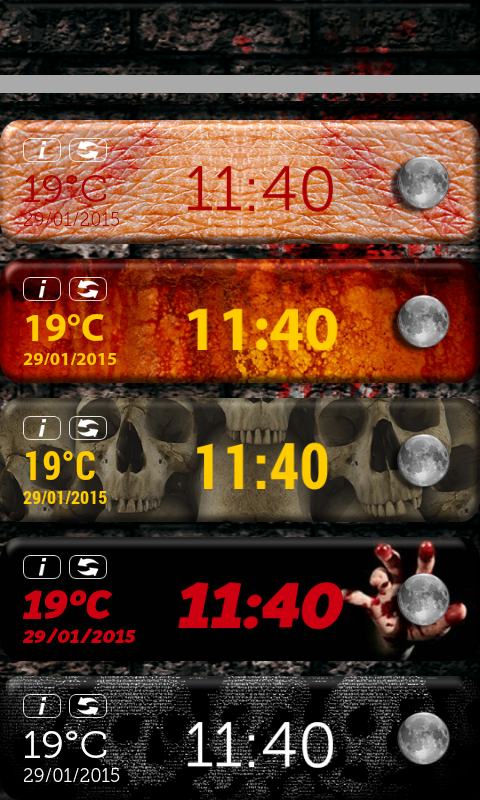 Not only you’ll have awesome digital clock you will also see the weather conditions on your screen. Local weather and world weather is available now for free. You don’t have to watch weather channel anymore to see the weather forecast. Download this widget and see whether it’s raining, snowing or it’s sunny outside. The best “weather widget” is now available you will see what’s the temperature and both Celsius and Fahrenheit measurement units are available! Download ☠ Scary Clock Weather Widget ☠ and transform your phone into something scary and spooky. Just select a digital clock and get a unique scary widget!