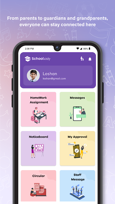 Aplikasi SchoolKtify membantu menghubungkan pengurusan, guru, ibu bapa dan pelajar. Guru, ibu bapa, penjaga dan datuk nenek boleh log masuk untuk melihat maklumat wad mereka. Jika ibu bapa mempunyai lebih daripada seorang anak yang belajar di sekolah yang sama tetapi kelas yang berbeza, mereka boleh mengakses butiran semua anak mereka dari papan pemuka yang sama.