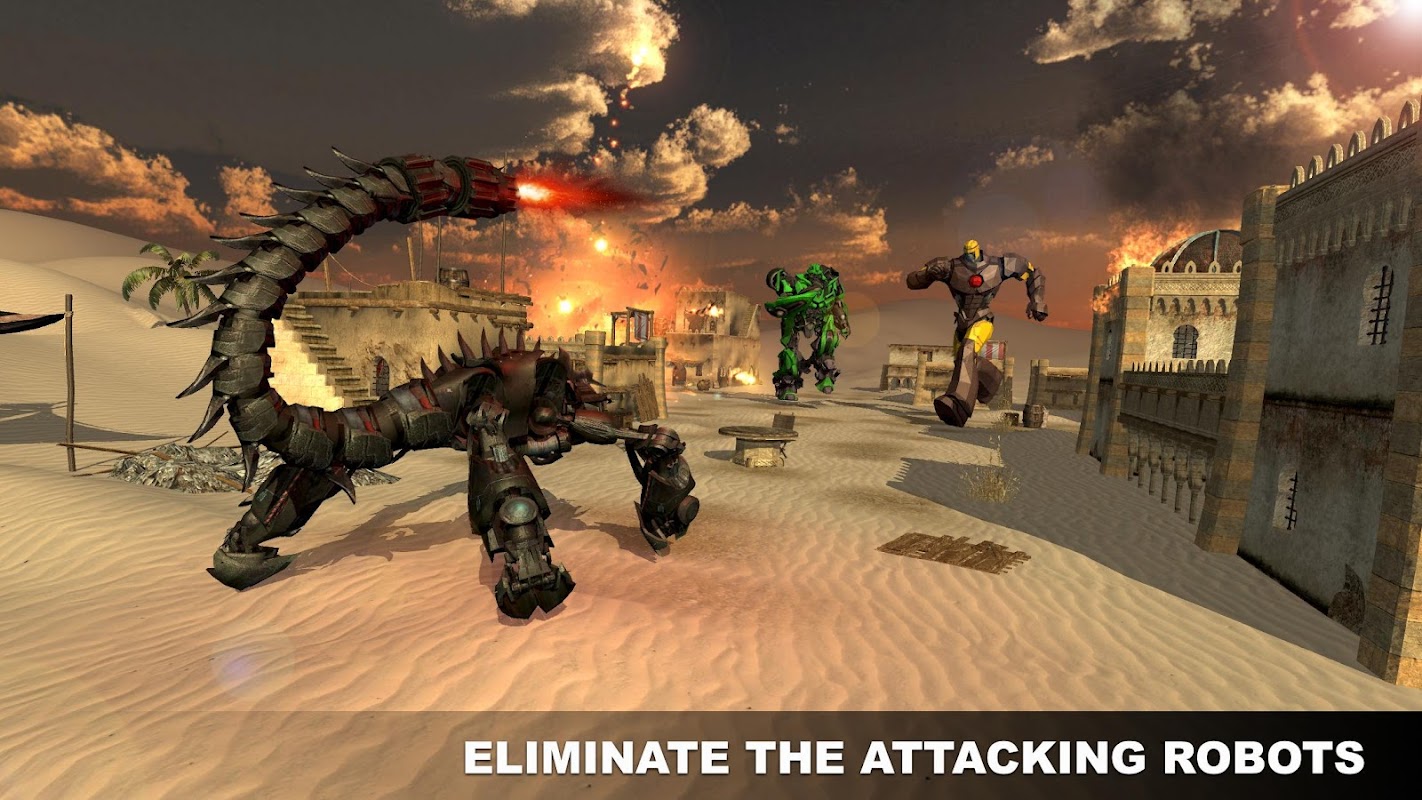 Scorpion Hero Transform Robot lets you play as scorpion robot or futuristic robot equipped with latest real physics based scorpion simulator and highly advanced battle simulator on highly intense cargo station protection duty in well spread desert storm utilizing instant kill desert shooting of robot war. Be a futuristic warrior robot or eminent superhero robot and defeat all x robot autobots along with their supreme leader flying monster or vicious flying robot equipped with flying kill machine weapons and successfully protect all cargo stations in realistic desert environment. So what are you waiting for? download this highly engaging robot action simulator based game. Now!