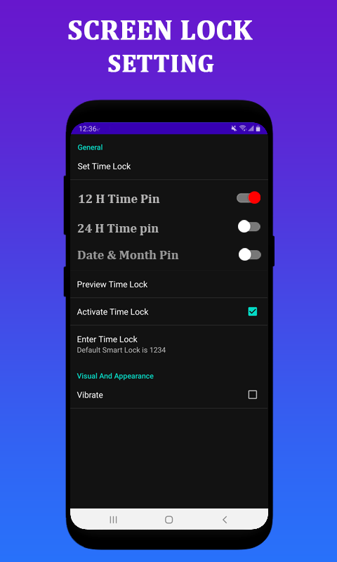 👉Enable or disable Vibration on Screen lock with Date PIN and Time PIN.