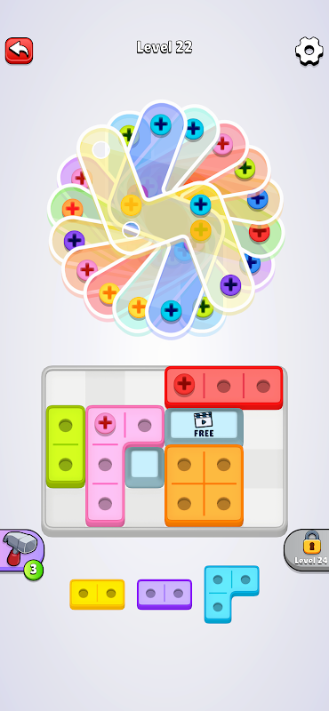 "Blok Skru" ialah permainan teka-teki yang menyeronokkan dan strategik di mana anda memuatkan blok untuk membuka semua bolt pada papan!