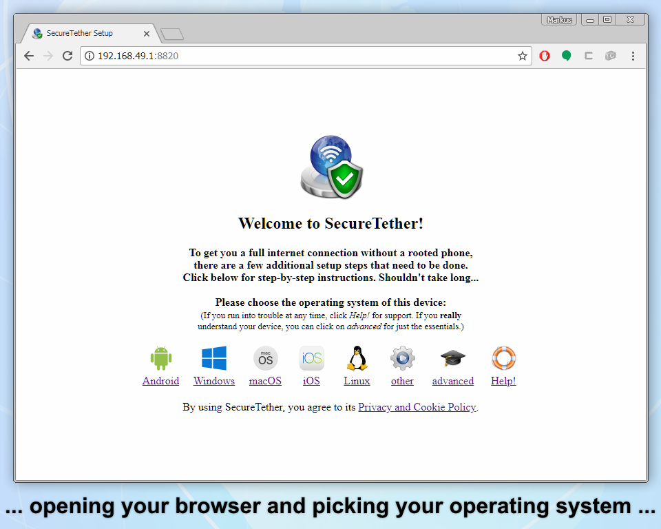 Peranti klien Android memerlukan aplikasi klien kecil (kurang daripada 0.5 MB) yang boleh dimuat turun dari hotspot SecureTether (iaitu pemasangan tidak memerlukan internet).