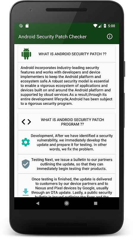 Permohonan ini akan memberitahu anda tentang patch keselamatan anda yang terkini atau tidak ia akan membantu anda untuk mendapatkan check.we patch keselamatan android terkini. Memeriksa patch secara langsung dari google terkini patch keselamatan terkini setiap bulan. Google akan melepaskan patch keselamatan setiap bulan dan kami mengambil butiran patch terus dari direktori mereka dan pemeriksa asas yang akan memberitahu anda!