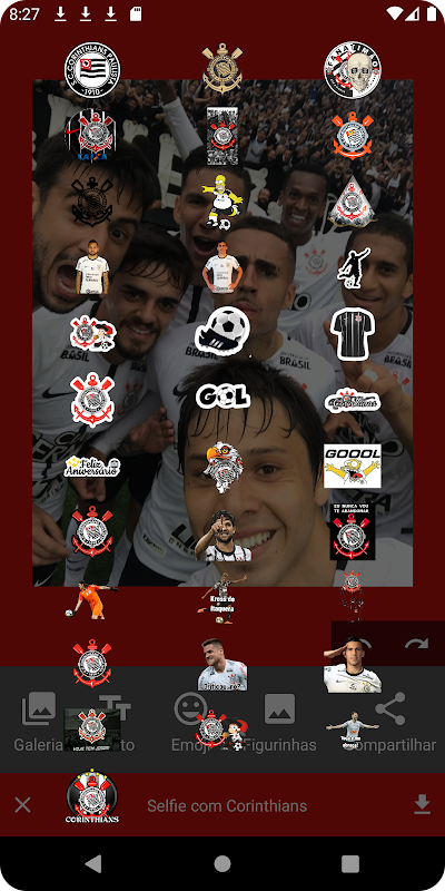 Dapatkan akses percuma kepada aplikasi penyuntingan foto ini dan hiasi swafoto anda dengan lambang dan beberapa imej Corinthians yang lain! Letakkan emoji dan teks pada foto anda dan tunjukkan kepada semua orang bahawa anda seorang fanatik Timão!