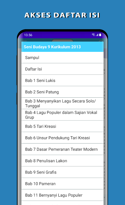 Buku Sekolah Elektronik (BSE) Seni Budaya SMP / MTs Kelas IX Semester 1 dan Semester 2 Kurikulum 2013. Aplikasi ini di buat untuk memudahkan siswa belajar Seni Budaya dimana saja dan kapan saja.