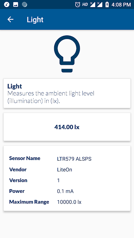 This Application Reads the Data from the sensors present in your device in Human readable format. Also Shows the Details of the sensors like Vendor name, Version, Power drawn from battery to run this sensor, Maximum Range of sensor value.